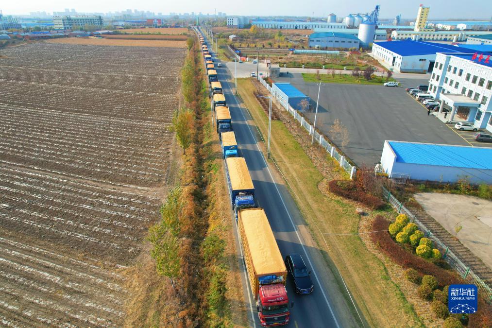 10月24日,送糧車在黑龍江省富錦市一大型糧食倉儲加工企業外排起長隊(無人機照片)。