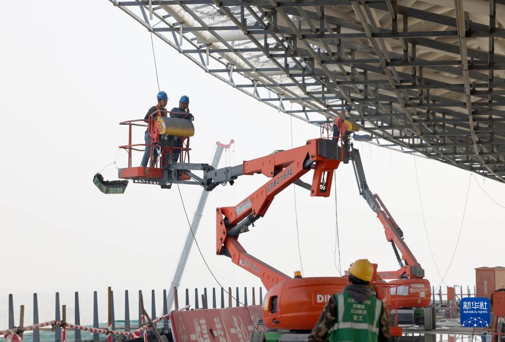 工人在雄安體育中心體育場施工(10月24日攝)。