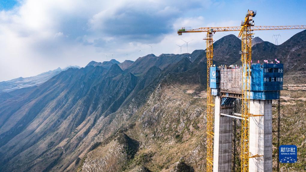 10月24日拍攝的六安高速花江峽谷大橋5號主塔(無人機照片)。