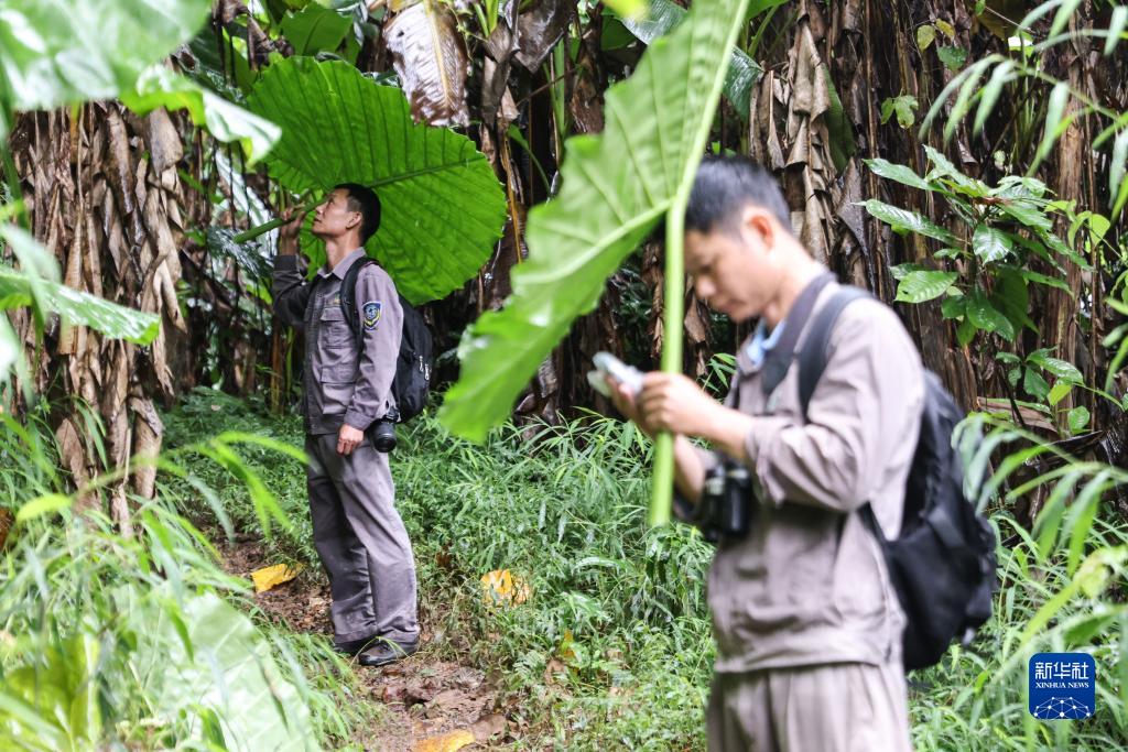 10月18日,海南長臂猿監測隊隊員李文永(左)和同事在海南熱帶雨林國家公園霸王嶺片區躲雨。
