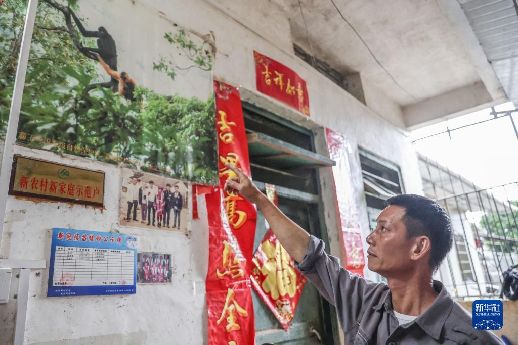 10月18日,海南長臂猿監測隊隊員李文永在家中給記者介紹墻上一張海南長臂猿照片背後的拍攝故事。