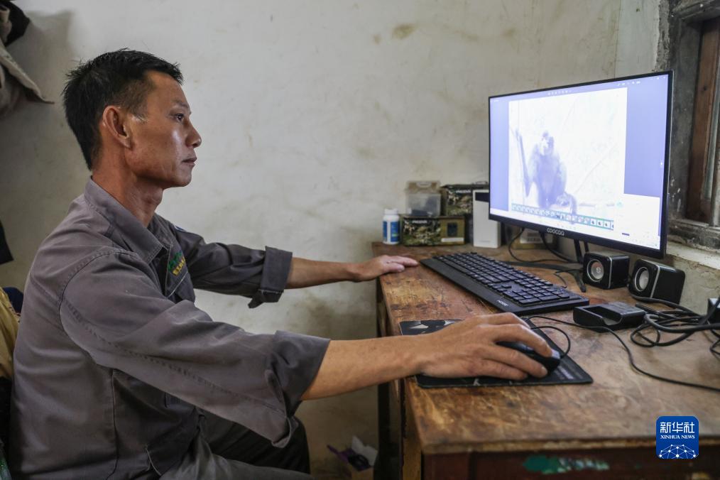 10月18日,海南長臂猿監測隊隊員李文永在家中查看拍攝的照片。