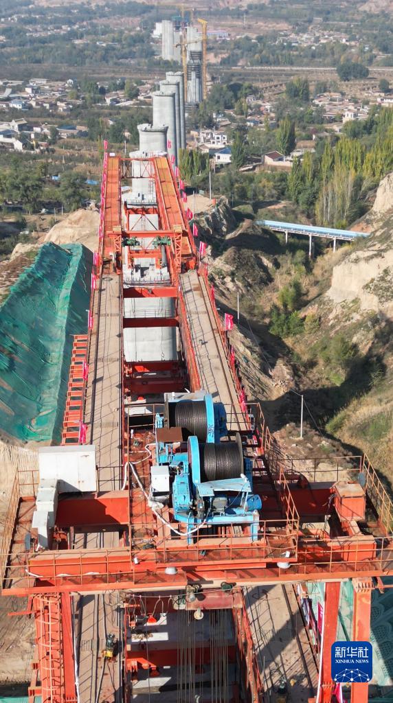 10月24日拍攝的位於甘肅臨夏境內的蘭合鐵路4標段泄湖峽大夏河特大橋膠拼梁架設施工現場(無人機照片)。