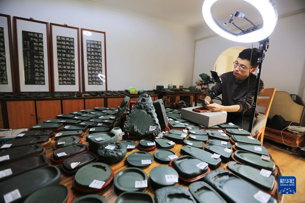 10月24日,工作人員在甘肅省定西市臨洮縣直播銷售洮硯。