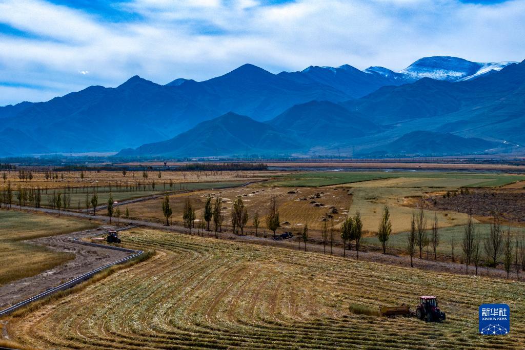 10月24日,村民駕駛農機在拉薩市林周縣強嘎鄉曲嘎強村收割牧草(無人機照片)。