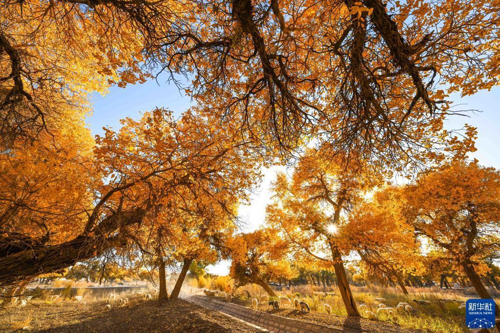 10月24日,羊群在胡楊林裏覓食。