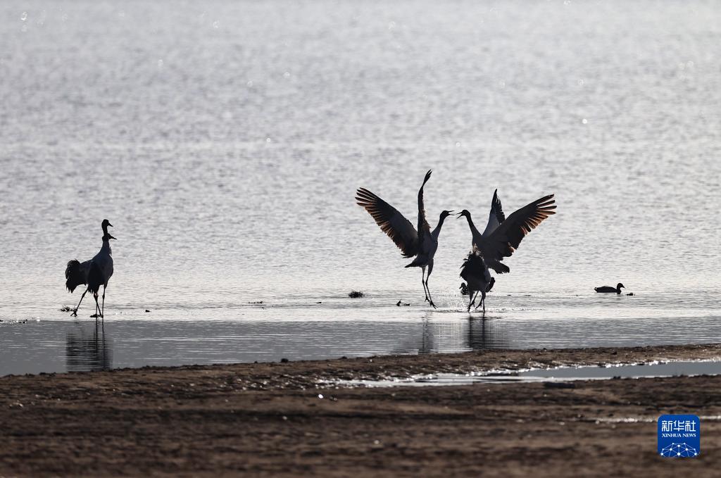 這是在拉薩市林周縣虎頭山水庫拍攝的越冬黑頸鶴(10月24日攝)。