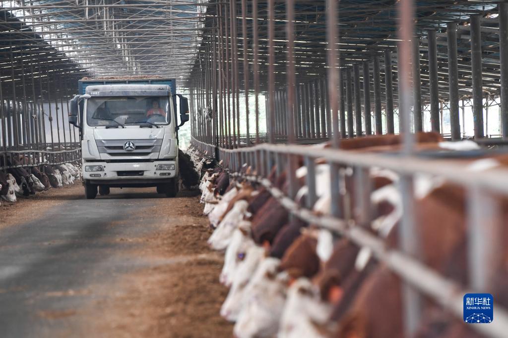 10月23日,在重慶市豐都縣高家鎮厚池壩村肉牛育肥場,工作人員駕駛撒料車給肉牛投料。