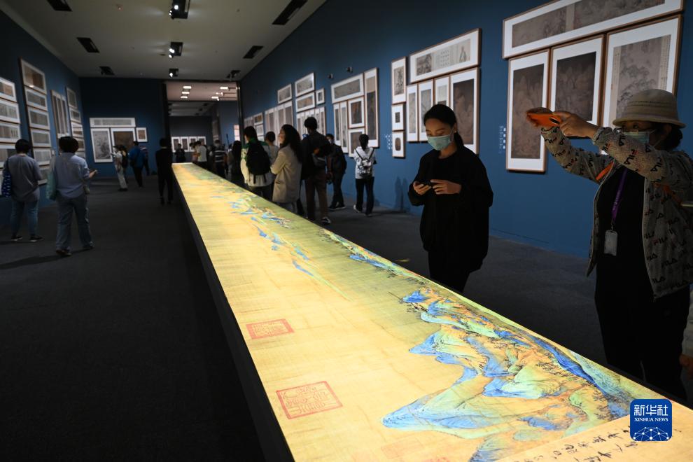 在位於北京的中國國家博物館“盛世修典——‘中國歷代繪畫大系’成果展”上,觀眾參觀放大兩倍的《千里江山圖》燈光特效圖(2022年9月29日攝)。展覽以圖像、文字、視頻、新媒體等多元展示手法,呈現“中國歷代繪畫大系”所反映的中國古代繪畫的宏富成就。