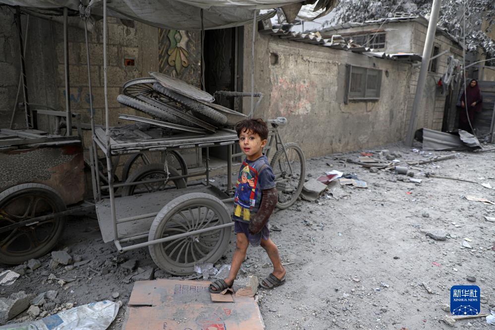 10月25日,在加沙地帶南部城市汗尤尼斯,一名男孩走在以色列空襲後的街道上。