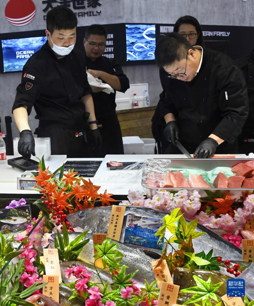 10月25日,參展企業在漁業博覽會上展示、加工水産品。
