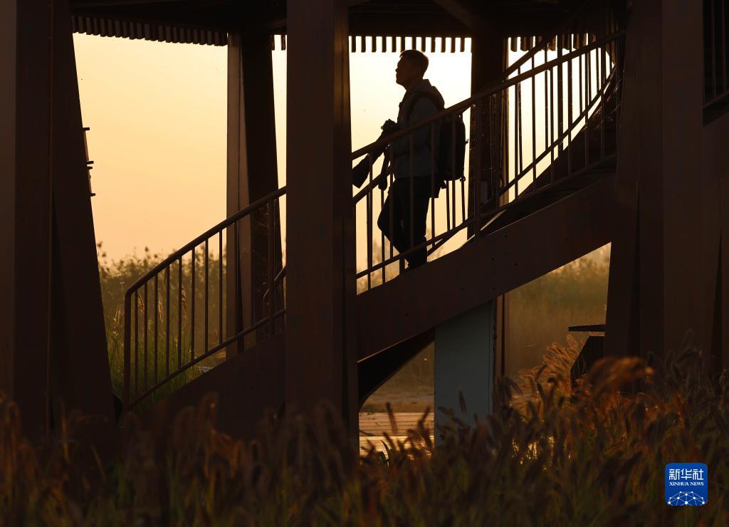 10月24日,韓戰橋在雄安新區孝義河河口濕地瞭望塔觀察野生鳥類。