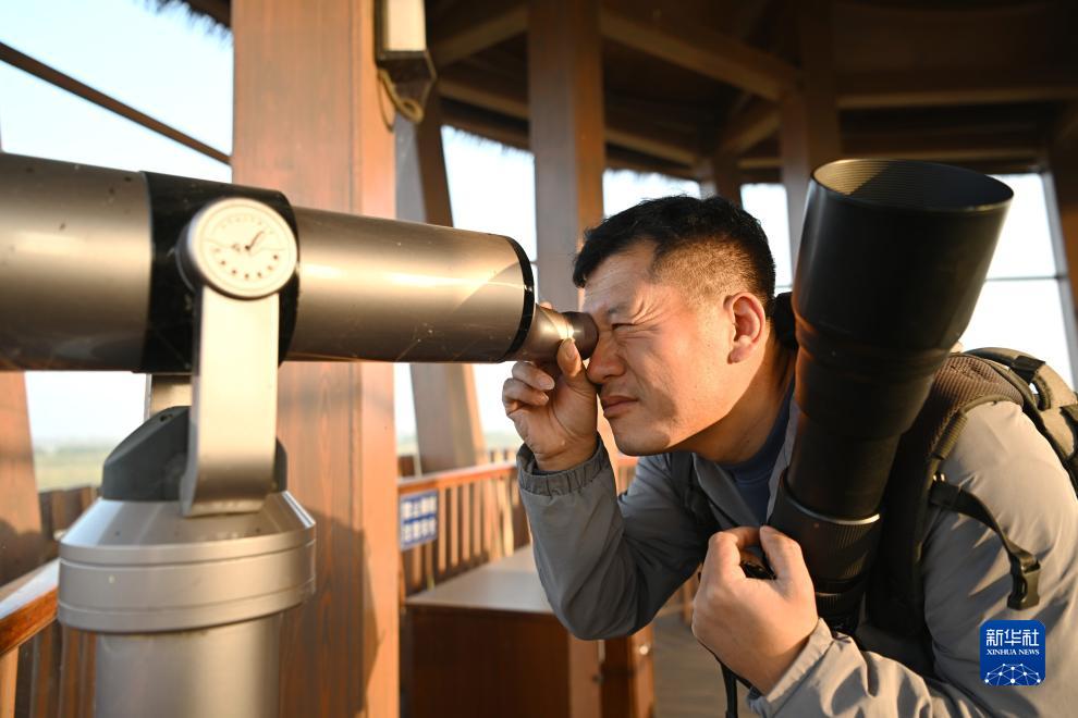 10月24日,韓戰橋在雄安新區孝義河河口濕地瞭望塔上用望遠鏡觀測野生鳥類。