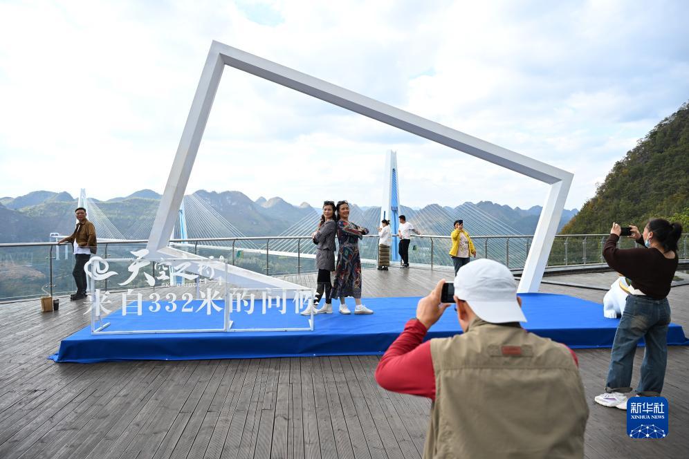 10月25日,游客在貴州省平塘縣“天空之橋”觀光服務區拍照留念。