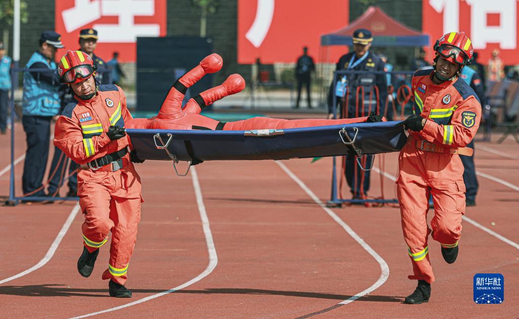 參賽選手在進行百米障礙救助項目比武(10月23日攝)。