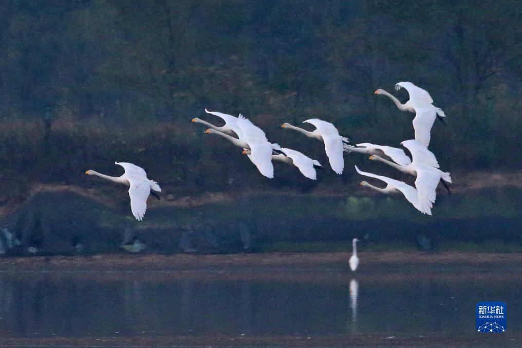 當日,在山東省榮成市天鵝湖,天鵝沐浴晨光,與湖光山色構成詩情畫意的美景。