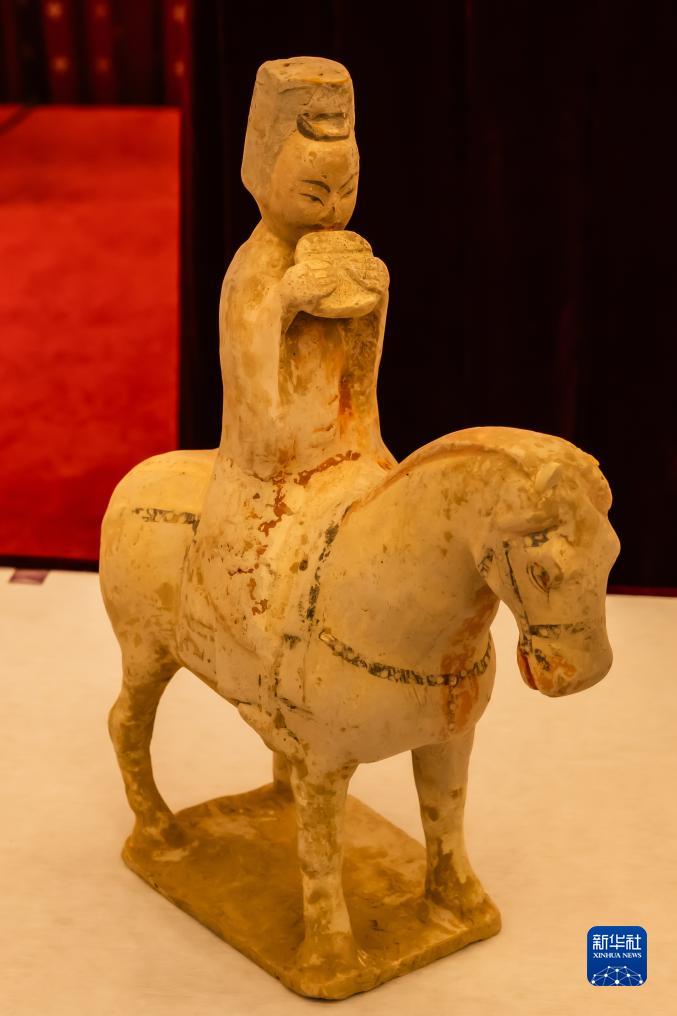 10月25日,在澳大利亞首都堪培拉,中國駐澳大利亞大使館展示澳返還的北朝至唐彩繪陶制人物騎馬俑。