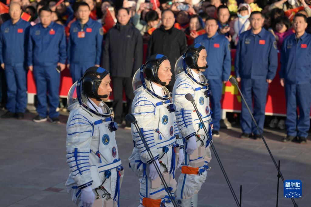 10月26日上午,神舟十七號載人飛行任務航天員乘組出征儀式在酒泉衛星發射中心問天閣圓夢園廣場舉行。這是航天員湯洪波(中)、唐勝傑(右)、江新林在出征儀式上。