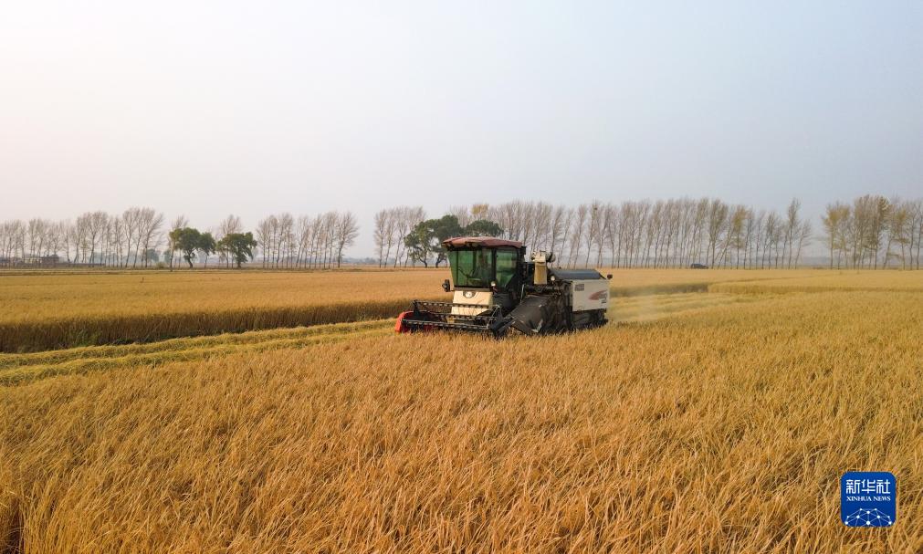 10月25日,收割機在瀋陽市沈北新區張家村的稻田中收割水稻(無人機照片)。