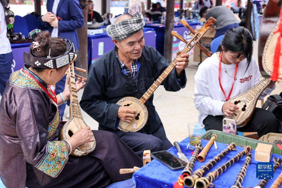 10月25日,布依族藝人在&江縣球場旁搭建的非遺集市上演奏月琴。