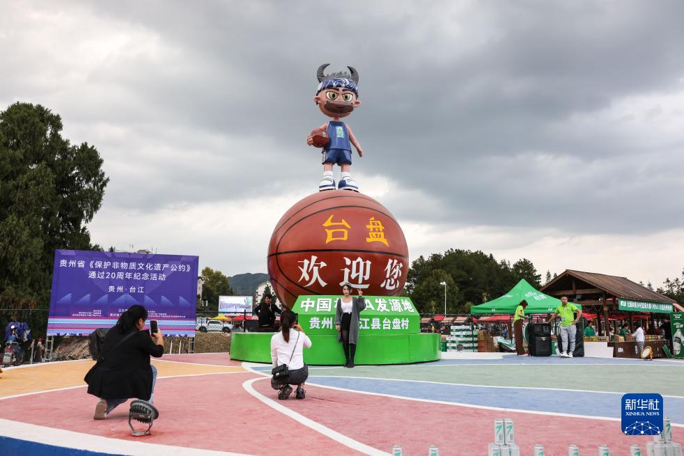 10月25日,游客與“和美鄉村籃球大賽”吉祥物合影。