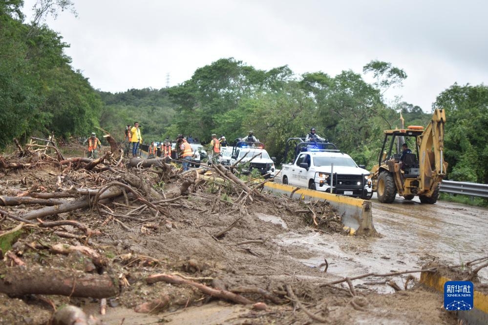 這是10月25日在墨西哥格雷羅州奇爾潘辛戈市拍攝的一處因颶風“奧蒂斯”過境而堵塞的道路。