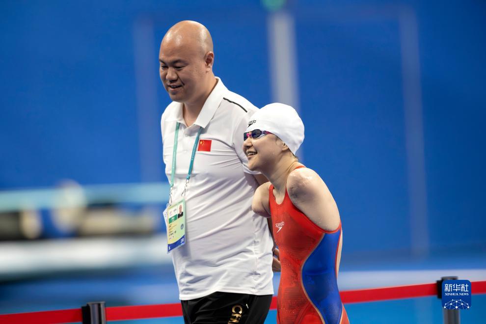 10月25日,盧冬(右)在杭州第4屆亞殘運會女子50米蝶泳S6級決賽後笑着與教練李健輝離開賽場。她最終獲得第四名的成績。