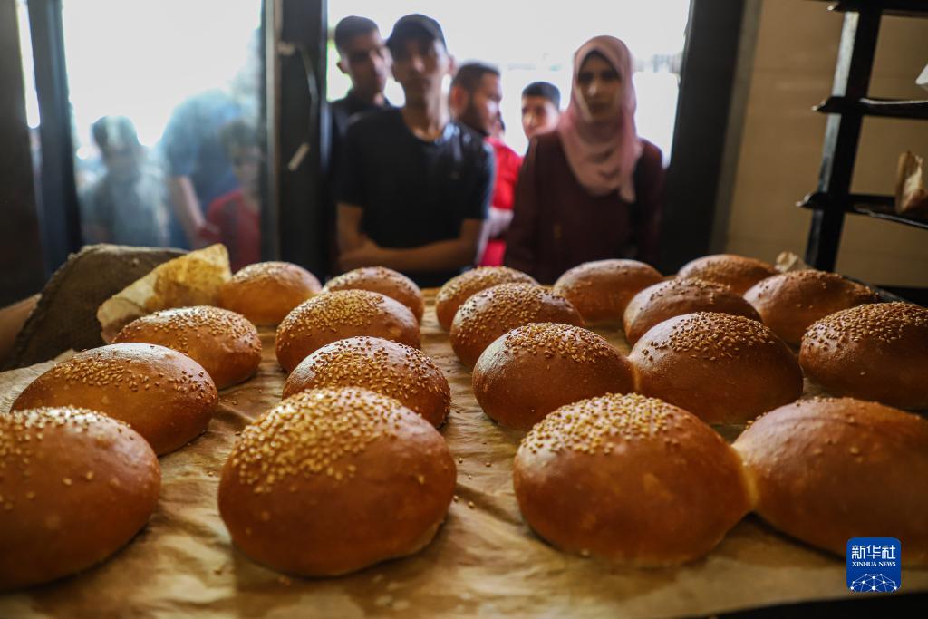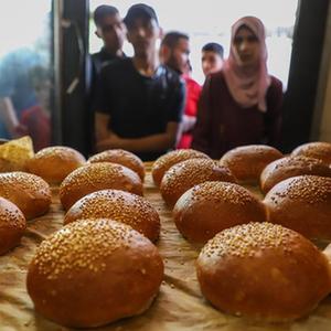 10月25日,在加沙地帶南部城市汗尤尼斯,人們在一家烘焙店外排隊購買麵包。