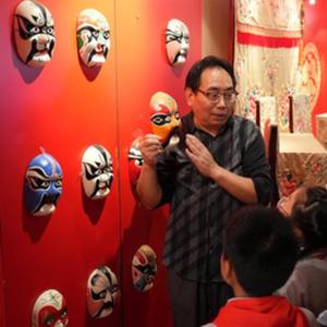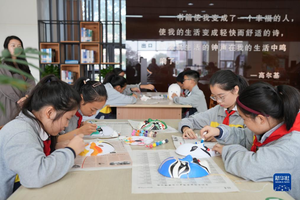 10月25日,在位於湖州市環渚街道的京劇服飾藝術館,湖師附小幸福裏校區的小朋友用畫筆描繪京劇臉譜。