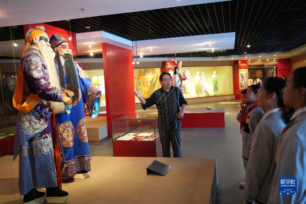 10月25日,在位於湖州市環渚街道的京劇服飾藝術館,湖州職業技術學院的老師給前來參觀的小學生講解館藏的京劇戲服。