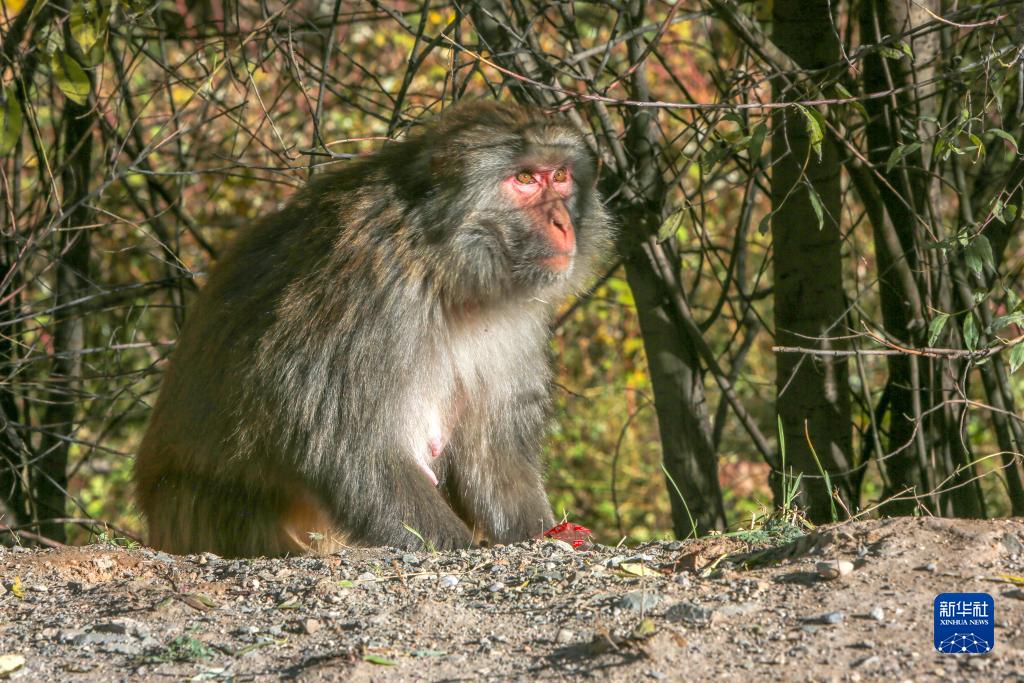 在317國道旁拍攝的野生藏獼猴(10月25日攝)。