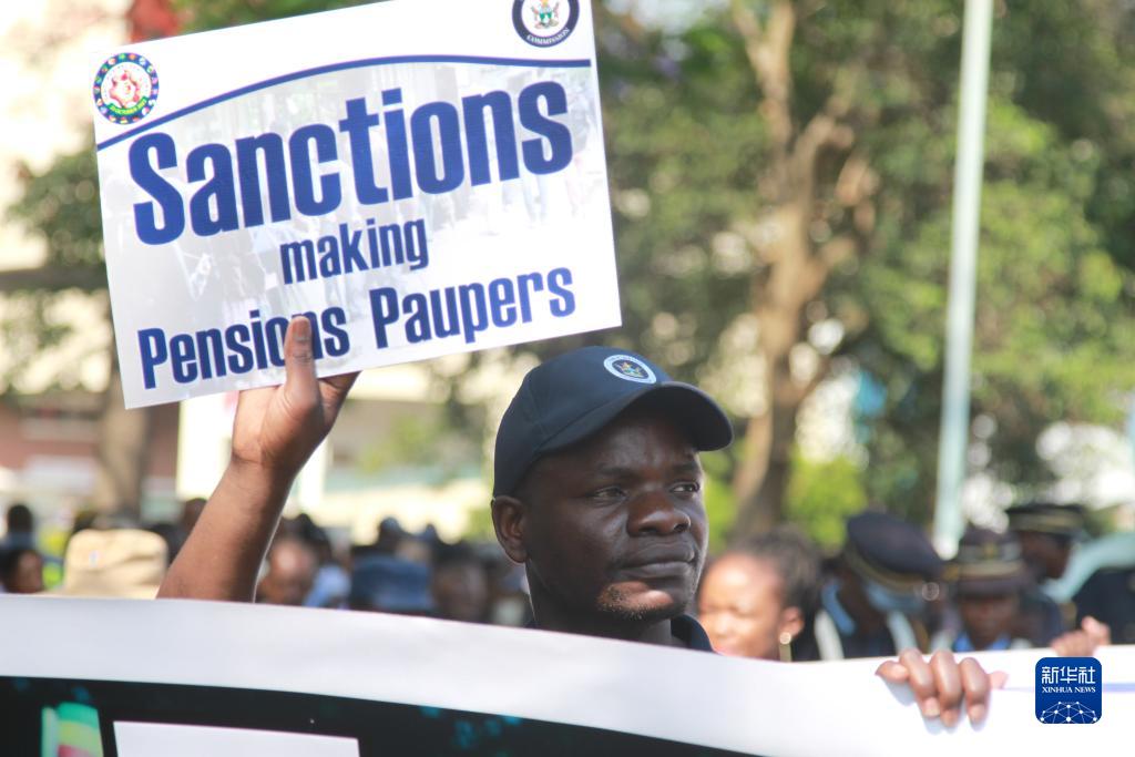 10月25日,在津巴布韋首都哈拉雷,一名男子手持標語參加抗議西方非法制裁的游行。