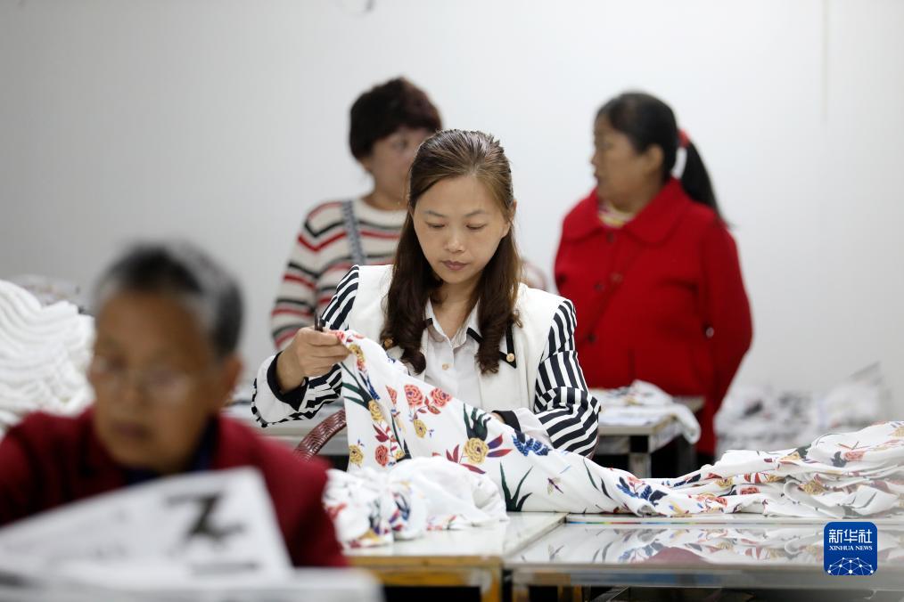 10月25日,村民在資興市州門司鎮州門司村就業幫扶車間加工服裝。