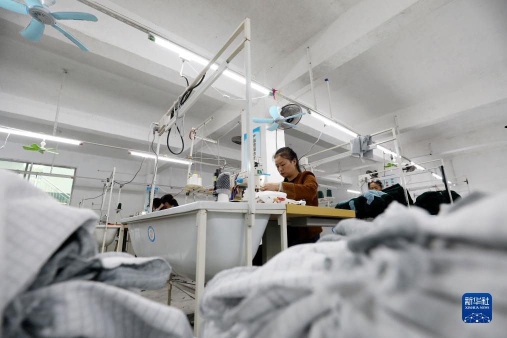 10月25日,村民在資興市州門司鎮州門司村就業幫扶車間加工服裝。