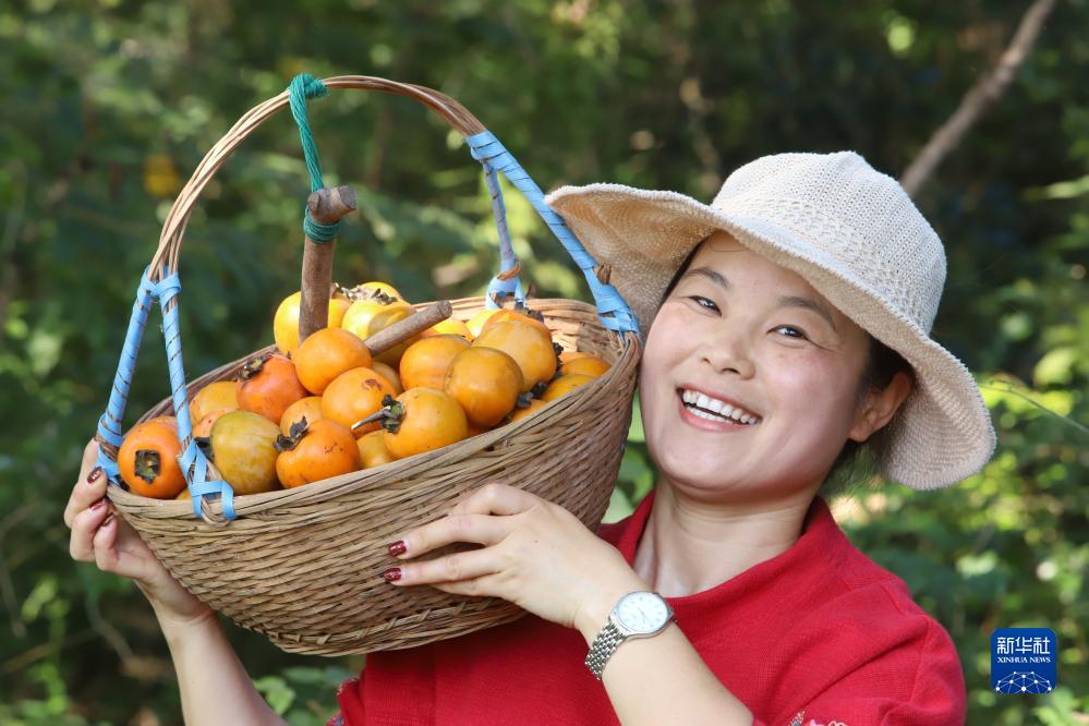 10月24日,在浙江省台州市路橋區峰江街道白楓岙村,村民展示採摘的柿子。