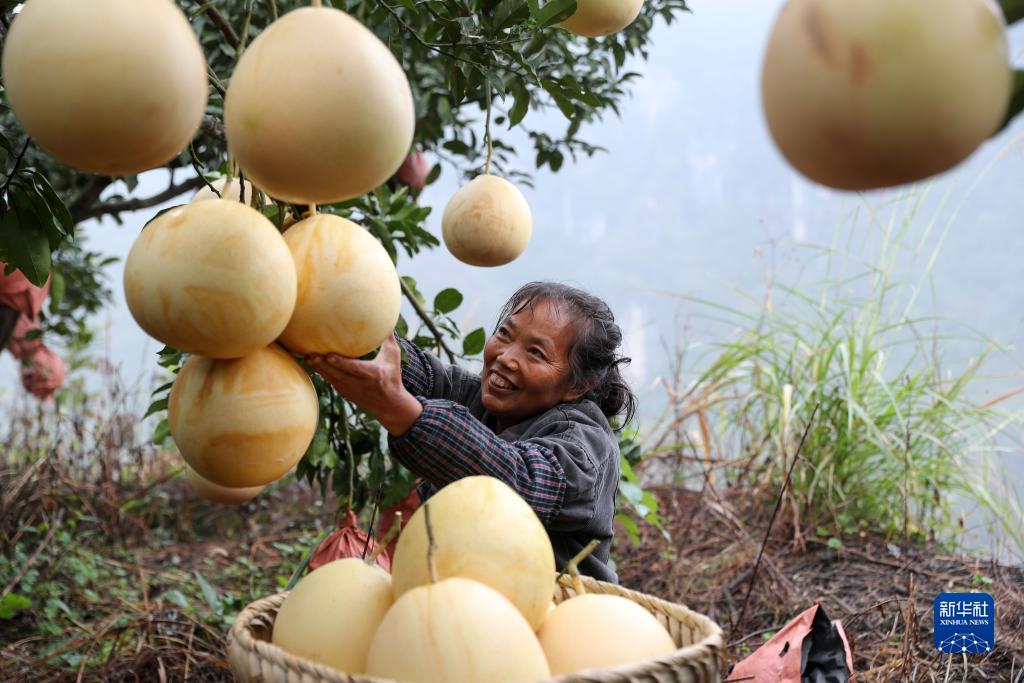 10月26日,村民在貴州省開陽縣花梨鎮清江村蜜柚種植基地裏採摘柚子。