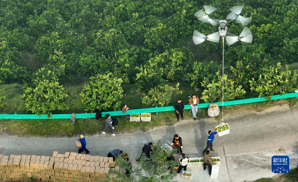 10月24日,湖北省宜昌市秭歸縣歸州鎮屈原廟村村民用無人機運送收穫的柑橘(無人機照片)。