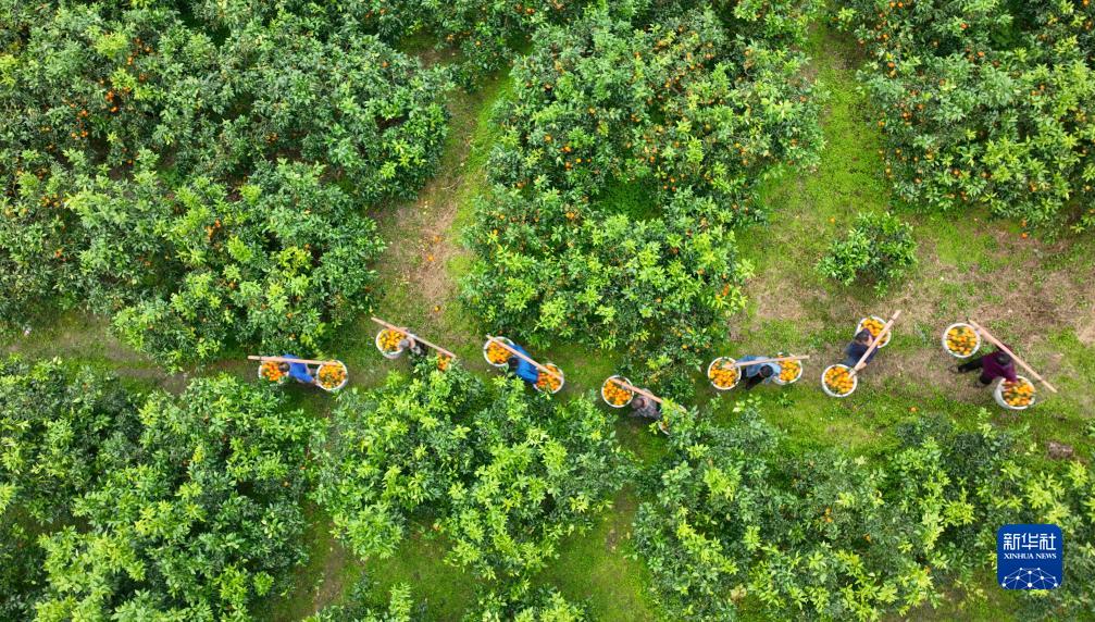 10月24日,四川省成都市雙流區永安鎮梨園村柑橘種植基地工作人員在裝運成熟的柑橘(無人機照片)。