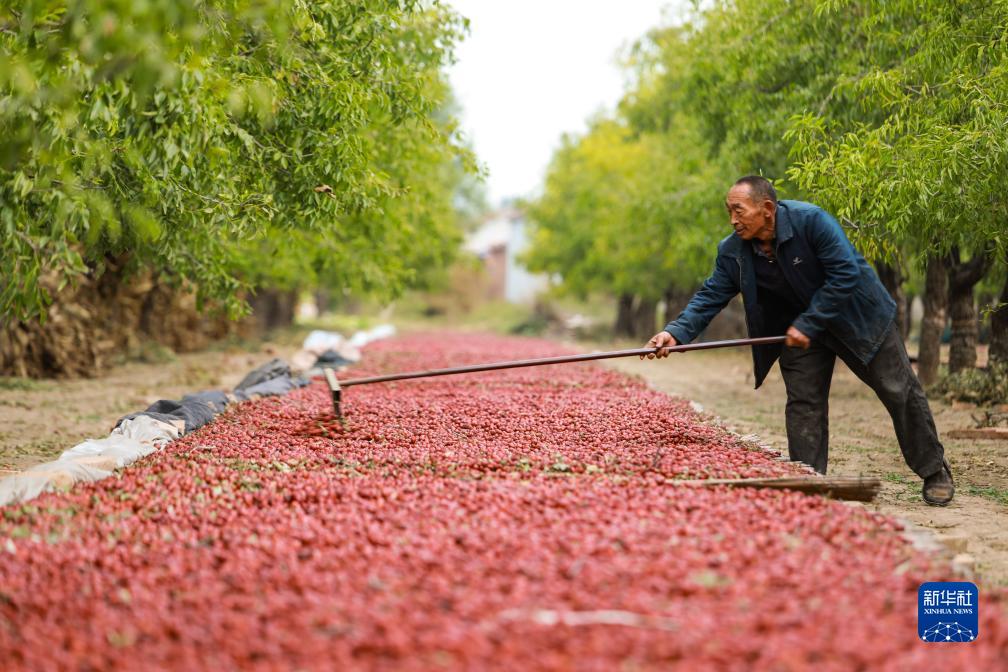10月7日,山東省樂陵市朱集鎮後朱村棗樹合作社社員在晾曬小棗。