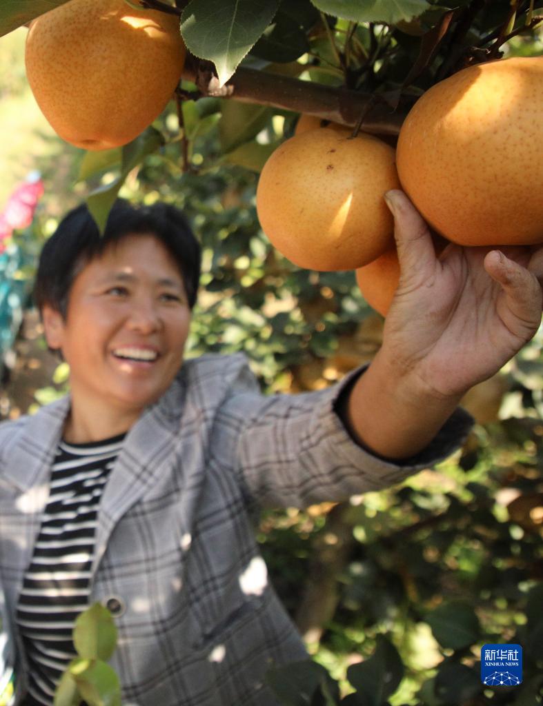 10月9日,在河北省邯鄲市廣平縣平固店鎮南下堡村晚秋黃梨種植基地,農戶在採摘成熟的晚秋黃梨。