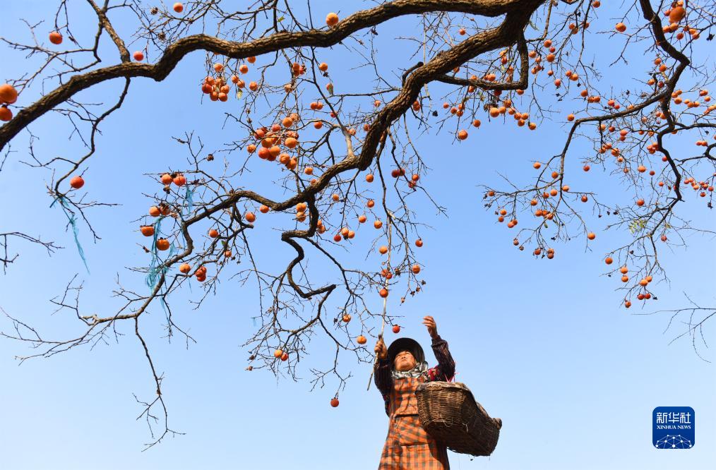 10月24日,山東省淄博市沂源縣石橋鎮分水新村的農民在采收柿子。
