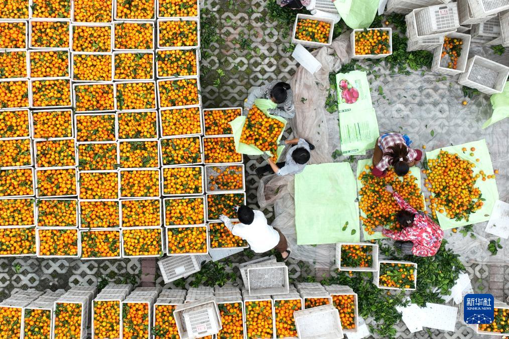 10月24日,四川省廣安市武勝縣龍女鎮青岩村果農在挑選砂糖桔裝框(無人機照片)。
