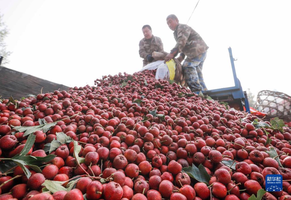 10月25日,農民在河北省遵化市一家山楂專業合作社堆放收購的山楂。