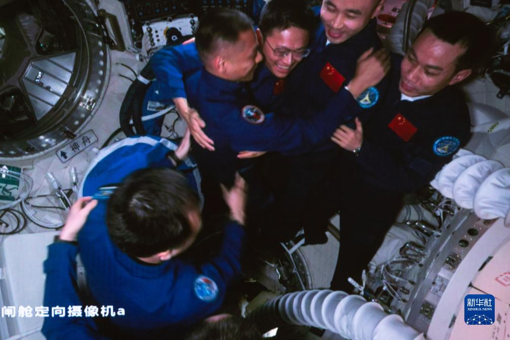 這是10月26日在北京航天飛行控制中心拍攝的神舟十六號航天員乘組與神舟十七號航天員乘組擁抱的畫面。