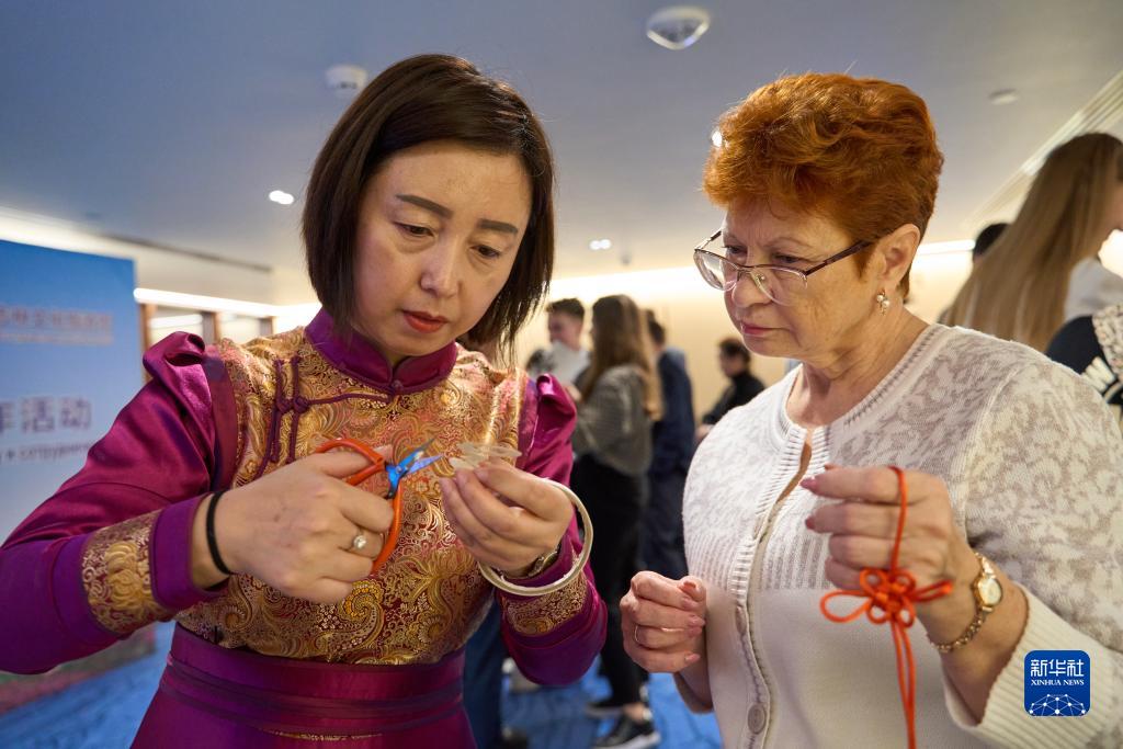 10月26日,在俄羅斯符拉迪沃斯托克,來自吉林省的手工藝人徐卉(左)向觀眾展示魚皮畫製作。