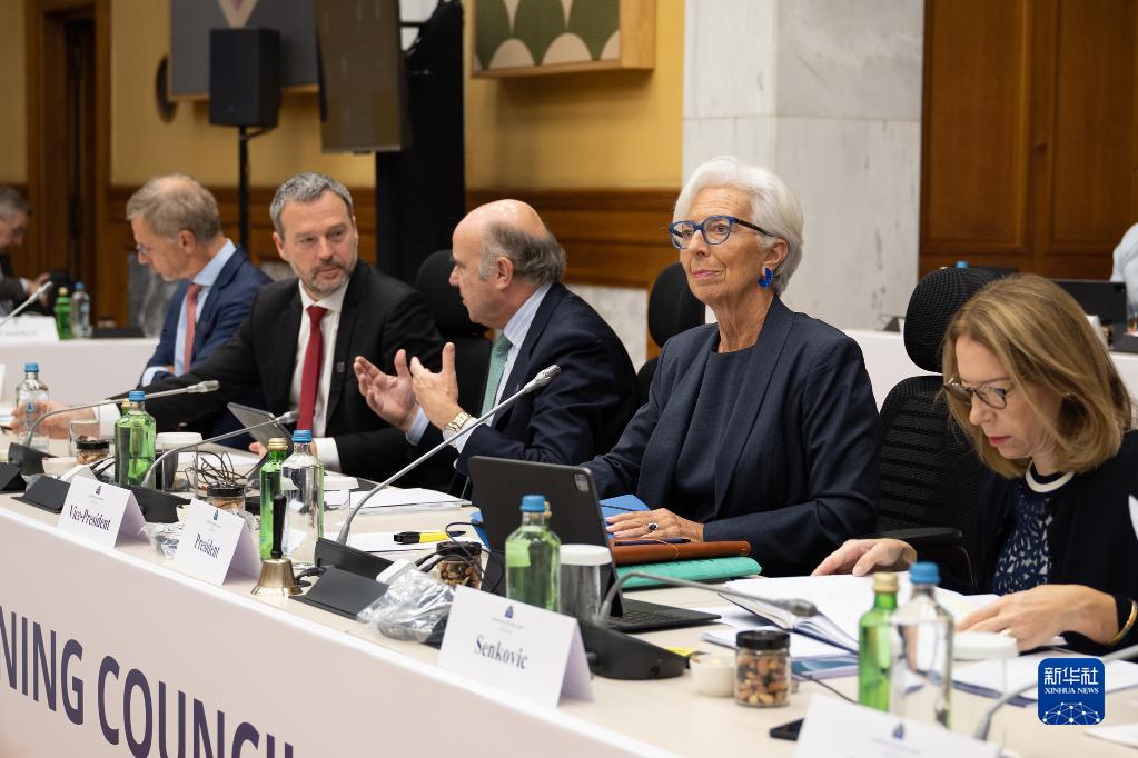 10月26日,歐洲中央銀行行長拉加德(右二)在希臘雅典出席歐洲中央銀行貨幣政策會議。