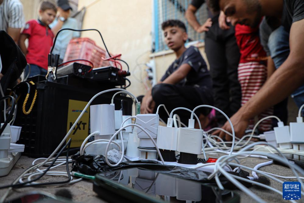 10月25日,在加沙地帶南部城市汗尤尼斯,人們在街頭給手機充電。