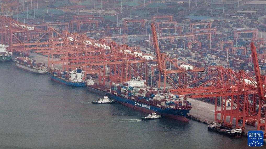 10月26日,在欽州港集裝箱裝卸碼頭,海事船正在協助海輪離岸(無人機照片)。