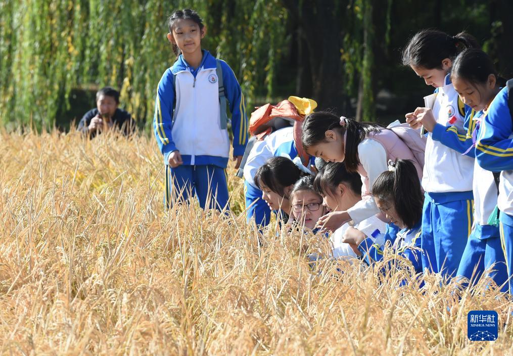 10月27日,來自中國農業科學院附屬小學的學生在圓明園“多稼如雲”景區的稻田邊觀察稻穀。