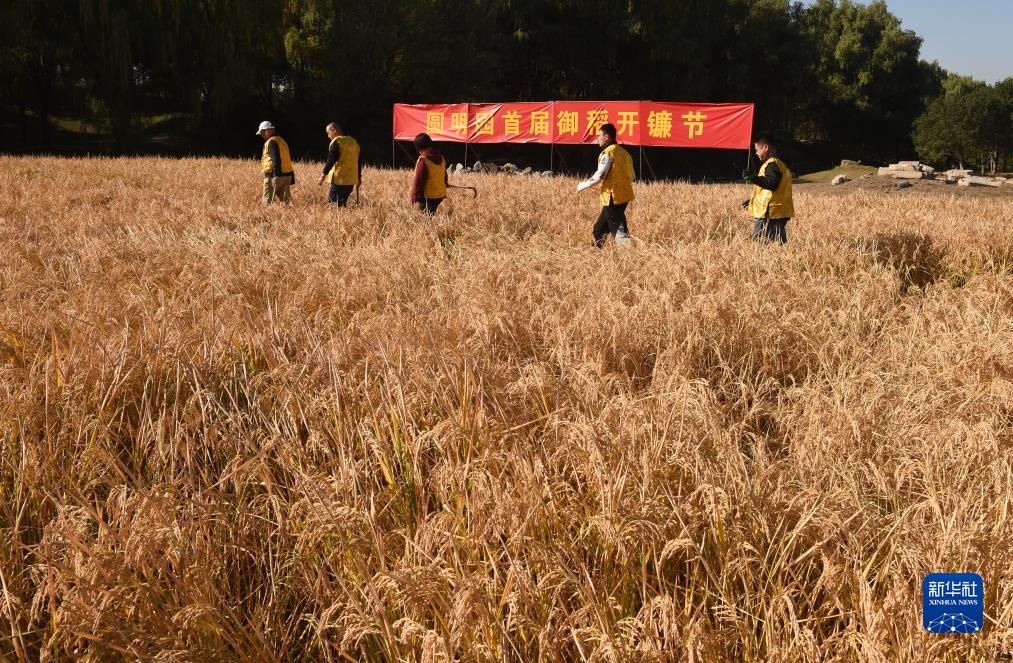 10月27日,工作人員進入圓明園“多稼如雲”景區稻田,準備開鐮。